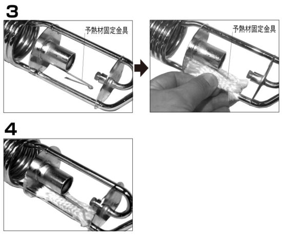 3.古くなった予熱材を取り外し、新しい予熱材を予熱材固定金具に差し込み取り付けます。